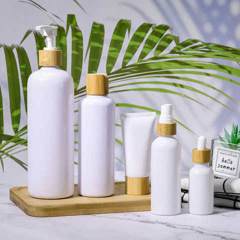 Paquete cosmético 100ml 150ml 250ml 500ml loción de cuerpo blanco champú botella de plástico con bomba de loción tapa de Bambú